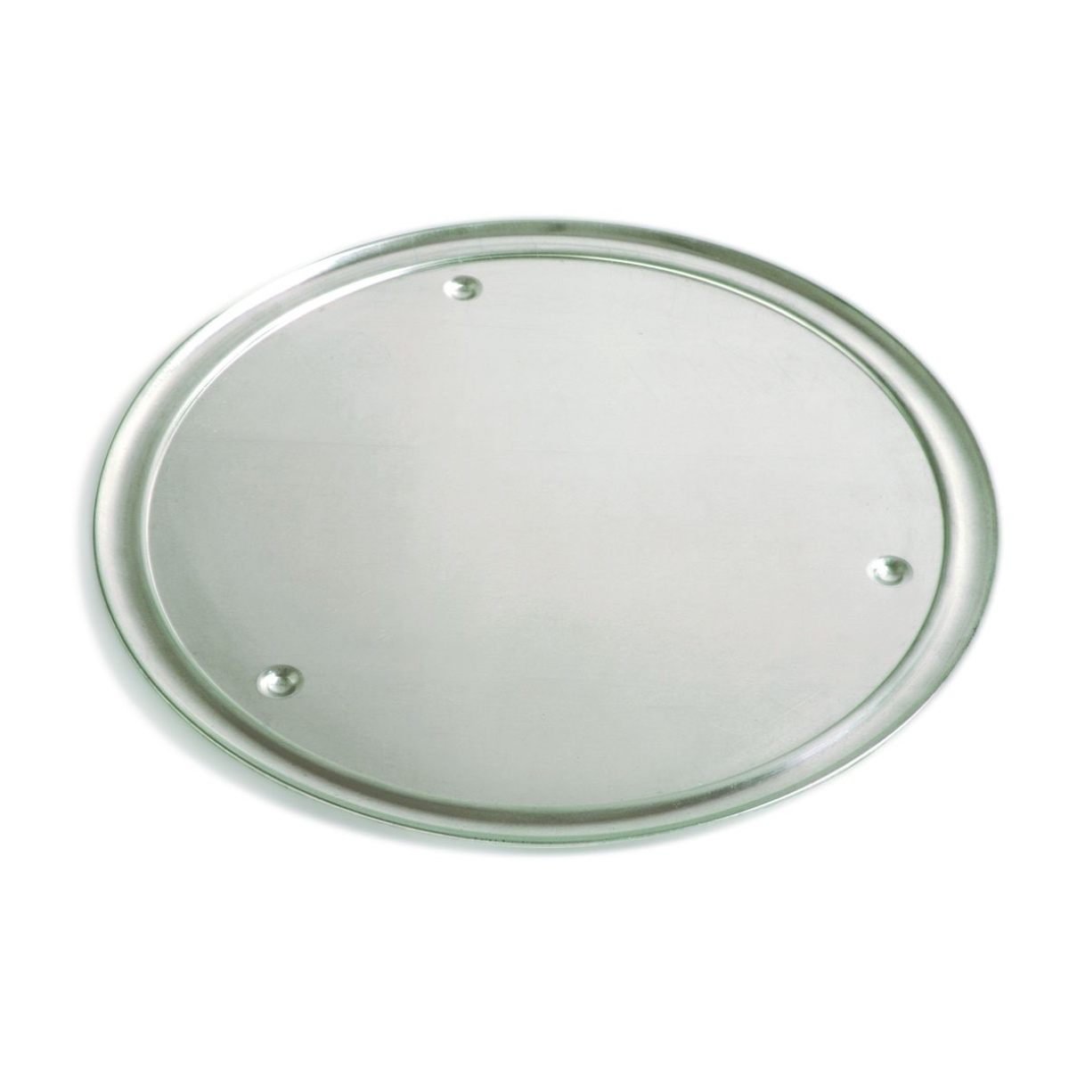 Alumiininen pizza-alusta kohotetuille reunoilla ja jaloilla. Suunniteltu hidastamaan pizzan jäähtymistä.