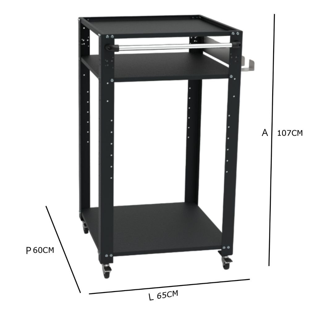 Kärryssä on kolme hyllyä, joista keskimmäinen on korkeussäädettävä. Tukihylly on kaatumisen estävä, ja sen enimmäismitat ovat 574 × 683 mm. Kokoaminen tapahtuu ruuveilla kierteellisiin holkkeihin, ja kulmissa on vakausruuvit. Tuote on suunniteltu ja koottu Italiassa